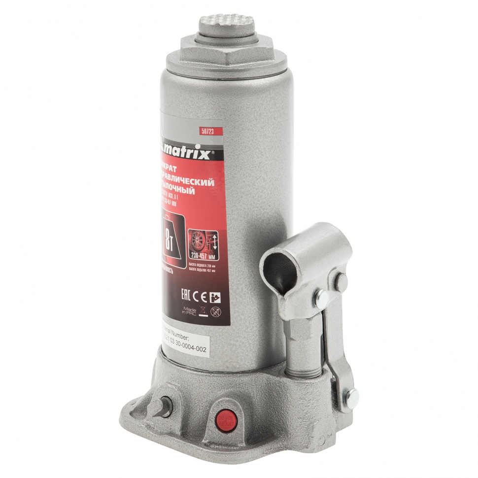 Домкрат гидравлический бутылочный, 8 т, высота подъема 230-457 мм Matrix