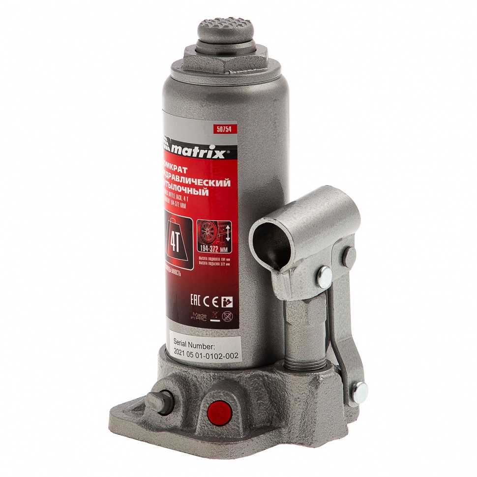 Домкрат гидравлический бутылочный, 4 т, высота подъема 194-372 мм, в пластиковый кейсе Matrix