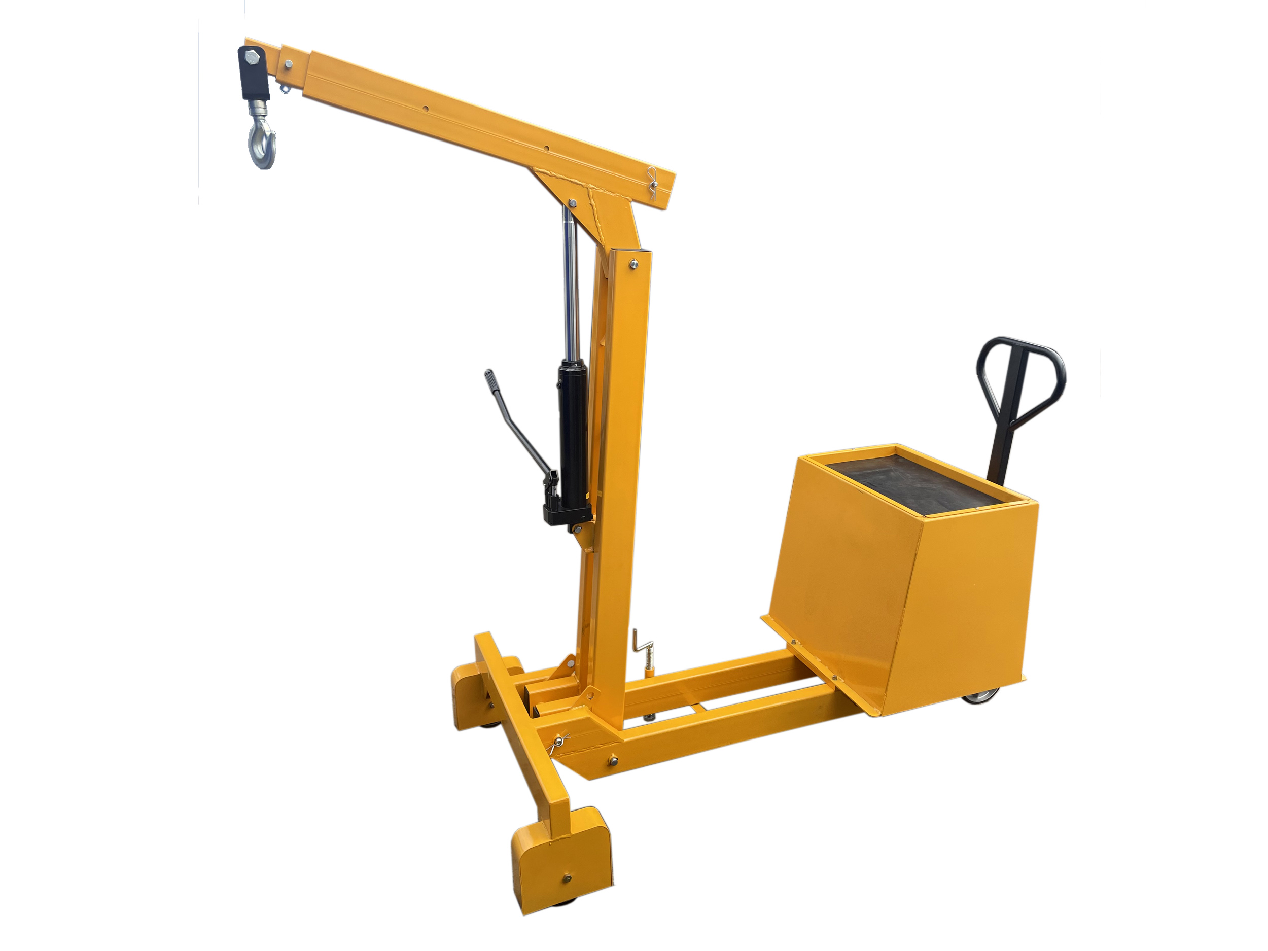 В продаже есть передвижные установки подъемным лебедочным механизмом. Управление оборудованием осуществляется вручную с помощью рукоятки. Функции, которые выполняет устройство, заключаются в подъеме и опускании грузов определенного веса. Модели с противовесом и без передних опорных стоек позволяют максимально близко подкатывать кран к рабочему месту.