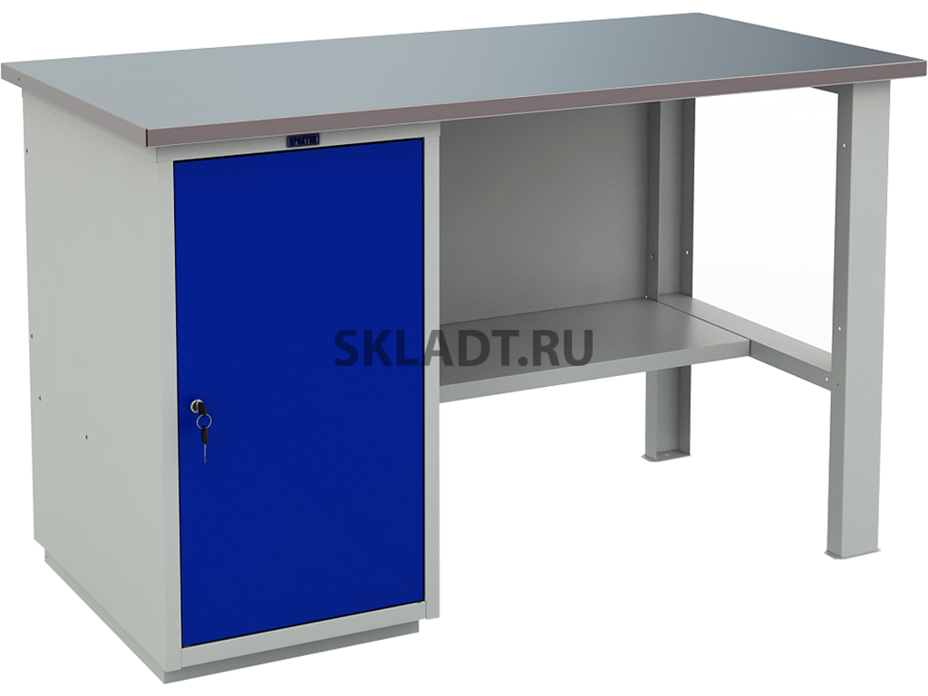 Верстак окрашен порошковой краской, цвет покрытия корпуса серый шагрень (RAL 7038), лицевая панель дверцы тумбы – синий шагрень (RAL 5002)